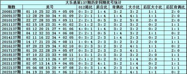 体彩大乐透第2024137期历史同期开奖号码分析: