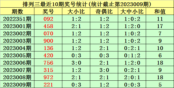 上期回顾:排列三第2023009期奖号为:221。奖号类型:组三,和值:5,奇偶比:1:2,跨度:1,大小比:0:3。