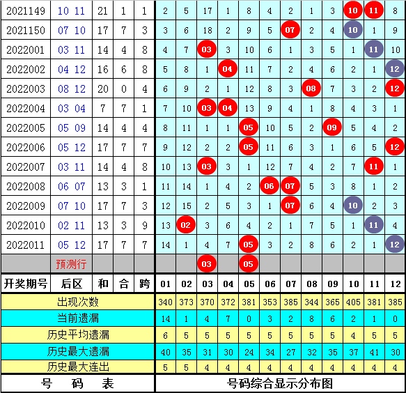 后区分析:上期后区奖号为05和12,最近十期后区开出9个热码、7个温码和4个冷码,本期预计奖号关注温码+热码组合,参考两码03、05。