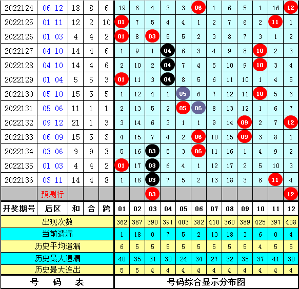 5、后区分析:上期后区奖号为:03和11,开出小大组合和奇奇组合,本期看好大小号持平,预计奇偶号平衡,两码看好03、12。