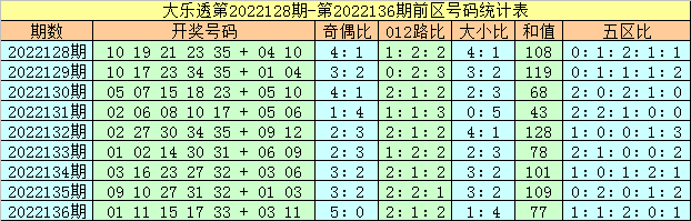 上期回顾:大乐透第2022136期奖号为:01 11 15 17 33 + 03 11,其中前区奇偶比5:0,012路比2:1:2,大小比1:4,和值77,五区比1:1:2:0:1。