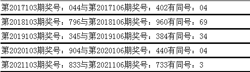 与前期历史同期奖号对比分析,在最近五年开奖中,第103期同期奖号与第106期同期奖号都出现了相同号码: