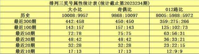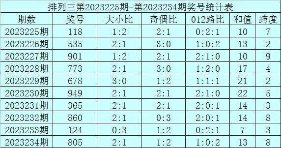 上期回顾:排列三第2023234期奖号为805,奖号012路比为1:0:2,奇偶比为1:2,大小比为2:1,和值为13,跨度为8。