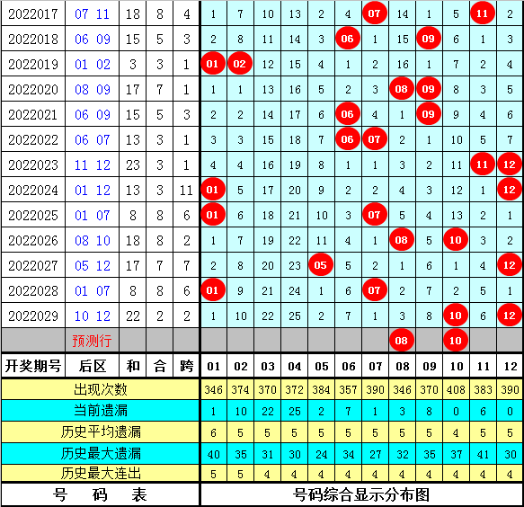 在历史同期开奖中,后区号码和值奇偶为10:5,其中偶号和值开出比例较低,本期注意偶号和值逐渐回补,关注和值18。