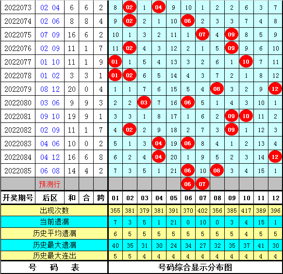 后区上期开出奖号:06+08,前6次后区奖号06+08出现之后,其下期分别开出号码:08+09、06+12、03+12、04+08、01+05、01+06,本期后区注意五码04 05 06 07,单挑两码06 07。