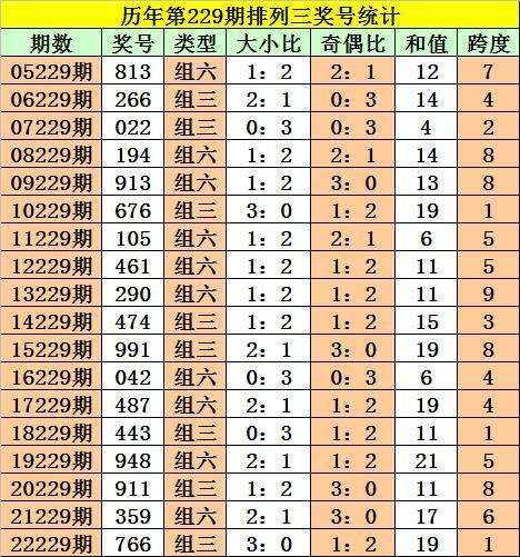 历年第229期奖号中:组三开出8次,组六开出10次。组三、组六基本相当,本期关注组六。
