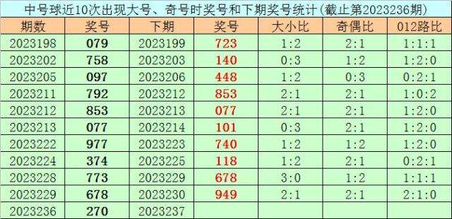 在中号球前10次开出大号、奇号类型之后,其下期分别开出奖号:723、140、448、853、077、101、740、118、678、949,其中号码奇偶比为4:6,大小比为3:7,012路比为1:7:2。
