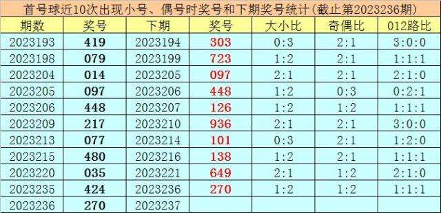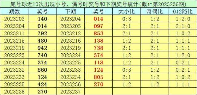 开奖回顾:体彩排列三第2023236期开出奖号270,奖号大小比开出1:2,奇偶比开出1:2,012路比开出1:1:1。