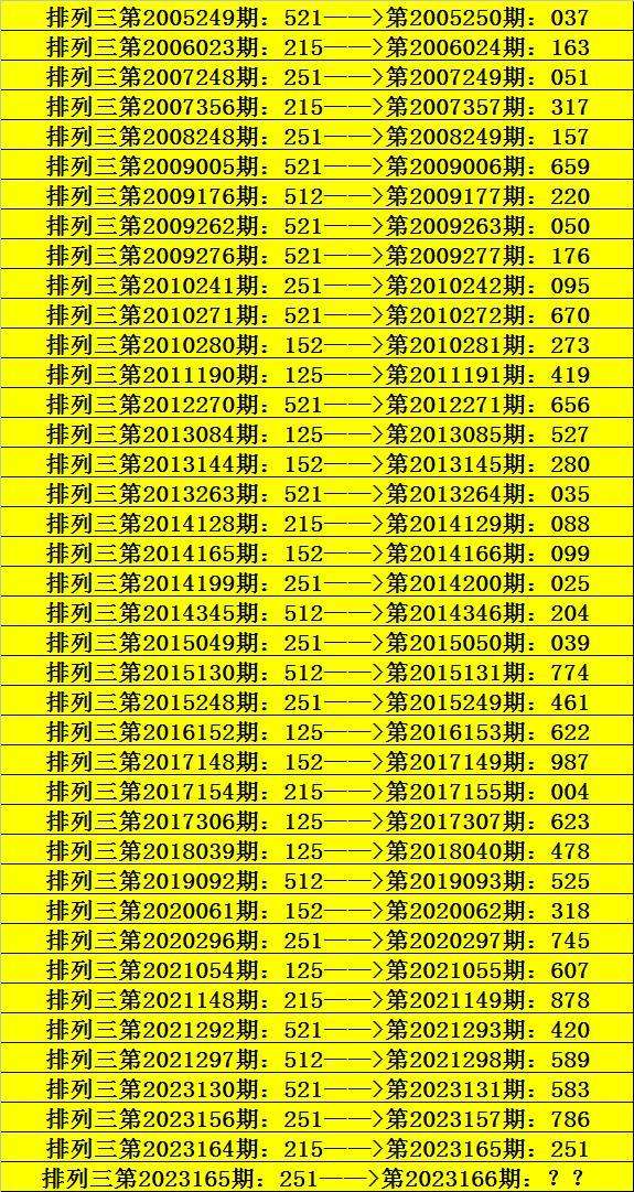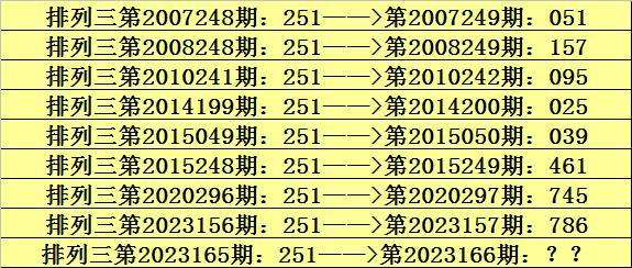 第2023165期排列三奖号为251,历史上该号码直选出现9次,下期奖号分别为:051、157、095、025、039、461、745、786。