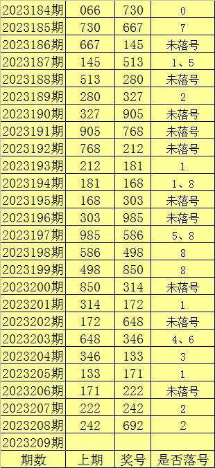 福彩3D第2023208奖号692,重号落号。在最近100期(第2023109期-2023208期)中,重号落号61期;最近20期重号落号概率为60%;最近10期重号落号概率为70%。本期预计重号可能落号。