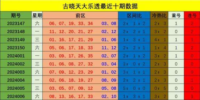 大乐透第006期奖号为:08 13 16 17 33,后区02 10。其中,前区三区比为1:3:1,冷热比3:2,重号0,连号16 17。