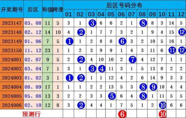 上期开出后区号码:02 10,偶偶组合。十期内出现2次偶偶组合,0次奇奇组合,6次奇偶组合,2次偶奇组合,近十期奇奇组合较冷,综合分析,本期预测偶偶组合开出,本期预测号码:02 06 07 10 12。精准推荐:06 10。