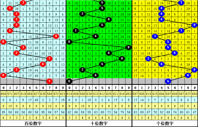 百位:下期百位1路号码开出次数较少,出现了1次,本期看好该位1路号码逐渐回补,参考号码7。