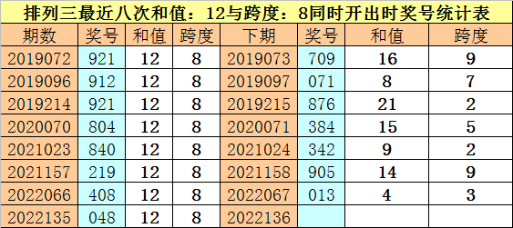 体彩排列三最近八次同时出现和值:12与跨度:8的奖号分别为:921、912、921、804、840、219、408、048,前七次下期开出奖号分别为:709、071、876、384、342、905、013,详见下表: