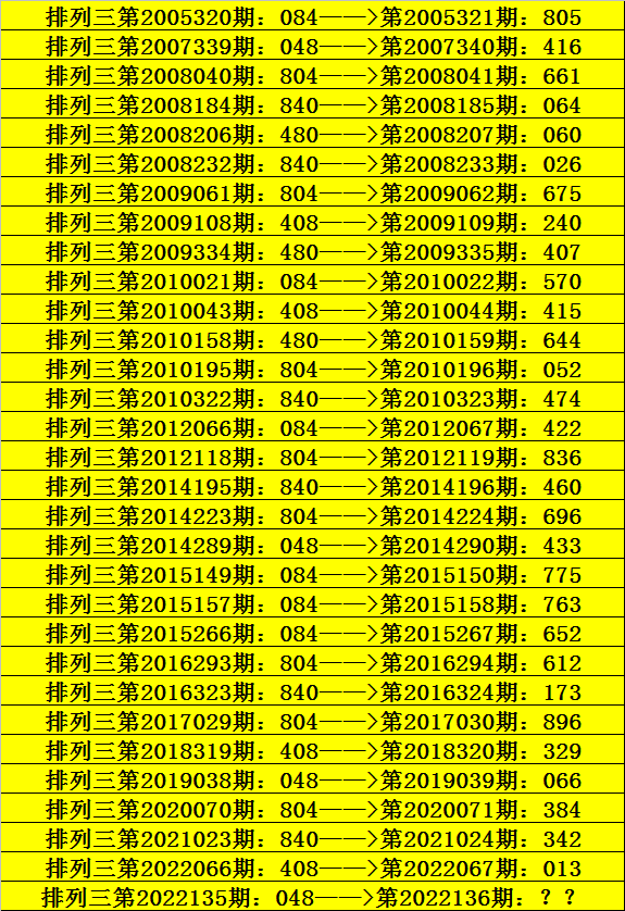 第2022135期排列三奖号为048,历史上该号码组选开出31次,下期奖号分别为:805、416、661、064、060、026、675、240、407、570、415、644、052、474、422、836、460、696、433、775、763、652、612、173、896、329、066、384、342、013。
