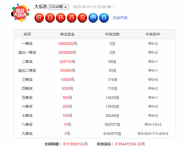 上期开奖:大乐透第2023048期开出奖号07、13、16、25、32+09、11。前区和值93,跨度25,奇偶比3:2,大小比2:3。后区和值20,跨度2。