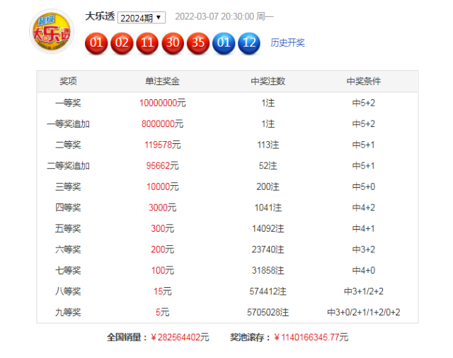 大乐透第2022024期奖号为:01、02、11、30、35 + 01、12。其中前区和值为79,跨度为34,奇偶比为3:2,五区比为2:1:0:0:2。后区和值为13,大小比为1:1。