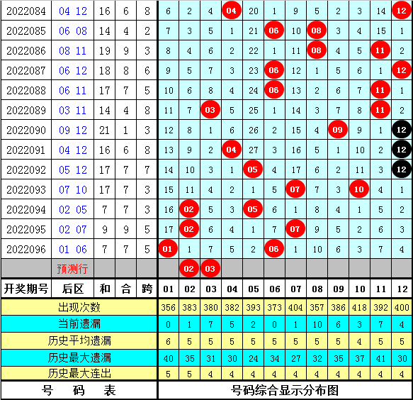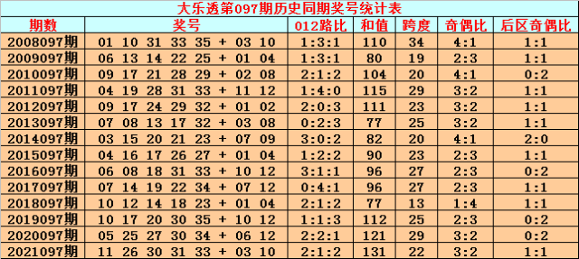 综上所述,大乐透第2022097期前区012路比参考1:2:2。