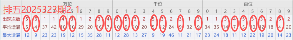 下图所圈出的为近30期各位置所出现的热码出现次数及平均遗漏值,用以参考和一些冷码组合选号。
