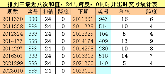 开奖回顾:体彩排列三第2023010期奖号为:888。和值为:24,跨度为:0。