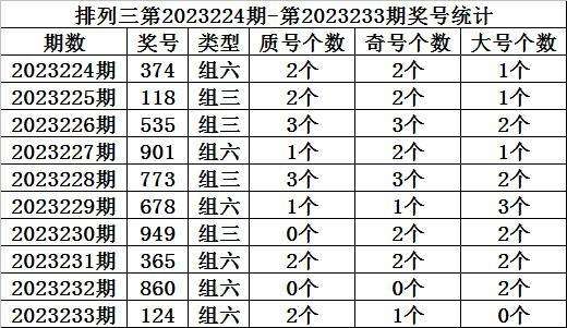 上期回顾:排列三第2023233期开奖:124,质合比为2:1,奇偶比为0:3,大小比为1:2。