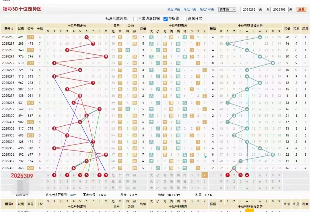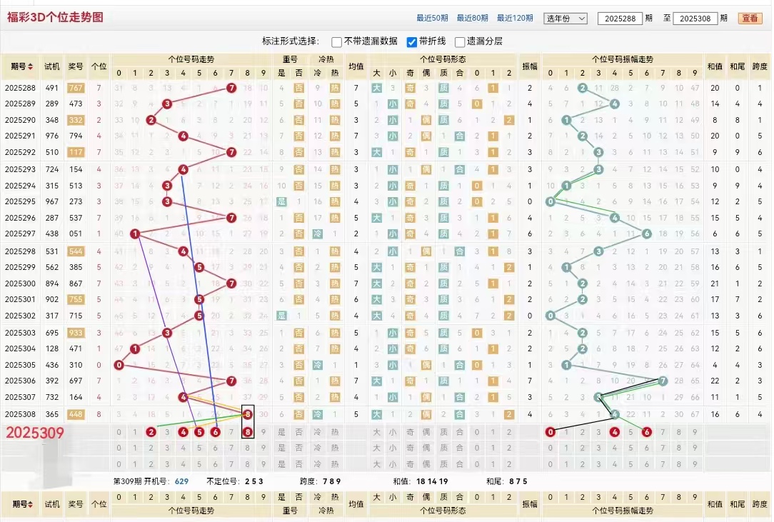 百位近期走势:2/5/0/5/3/8/7/7/9/4/3/6/1/4,质数占优开出9期,本期个人则重点看合数,质数太热小防一手,如上图振幅黑色线5/5/5隔3期2期1期对应数字9,黄色线2/3/4对应数字08,看左边绿色线4/3/2,黄色线3/4/5,紫色线5/7/9都等隔开出,综合上述百位推荐:123689