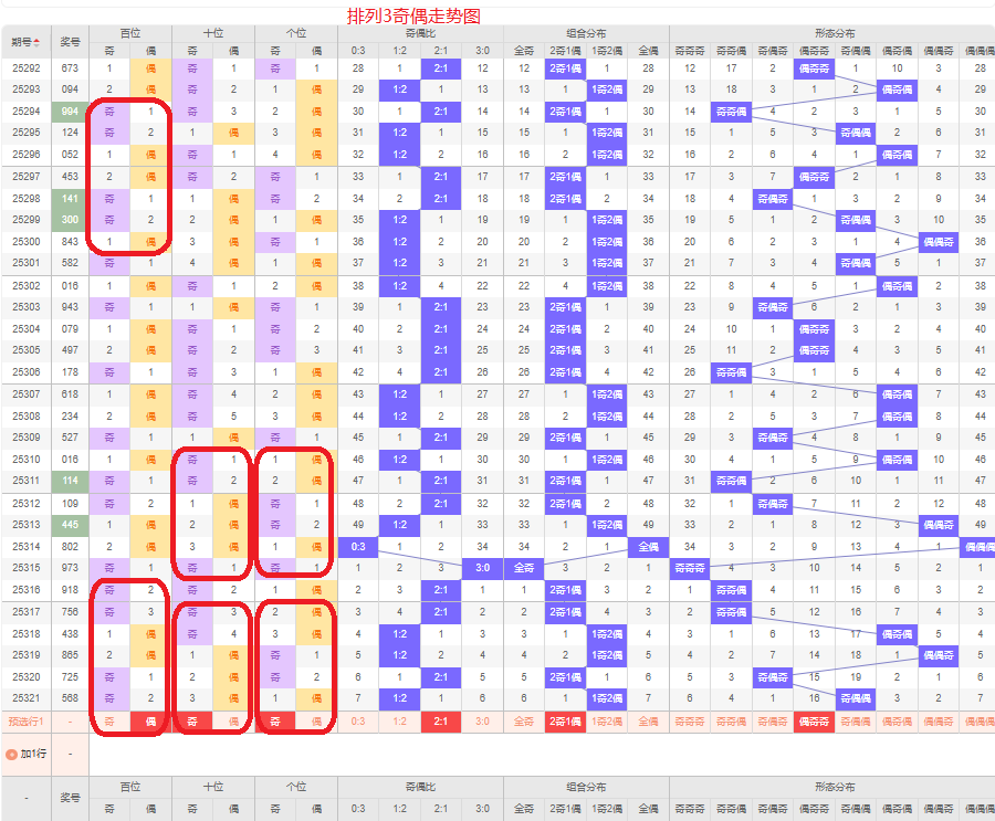 上一期的奇偶比为1:2,俩偶的号码组合,从近五期的奇偶数出现情况看,奇数出7次,偶数出现8次,奇数偶数号码出现较平均,本期要侧重两奇的号码组合,侧重偶奇奇或偶偶奇的号码组合,根据奇偶组合形态可做五码定位02468/13579/13579或02468/02468/13579