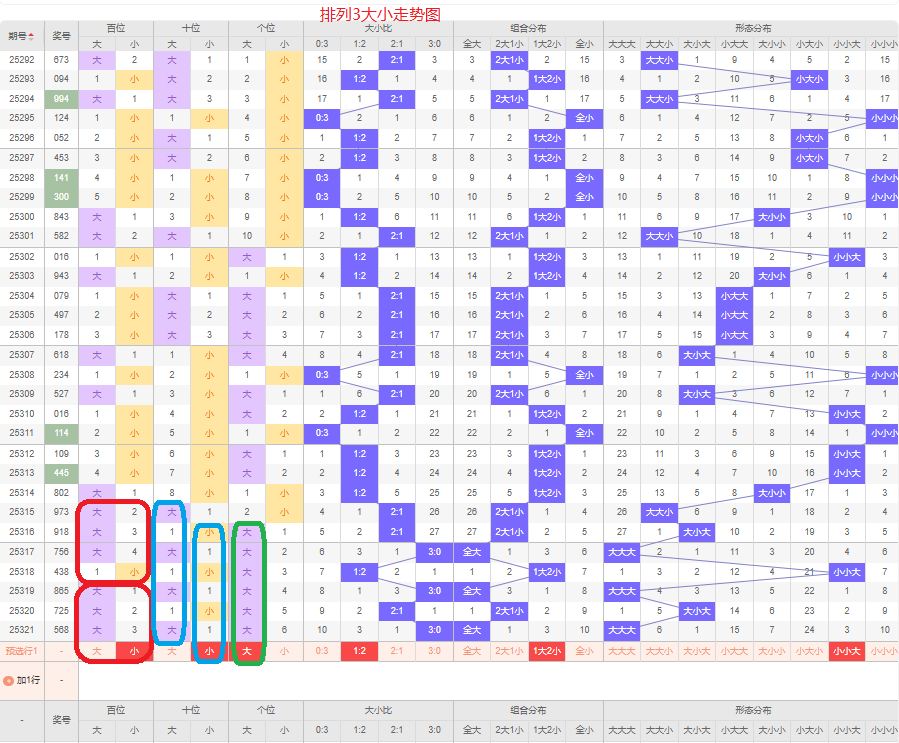 上一期大小比为3:0,全大的号码组合,近五期大号出12次,小号出3次,大号码出现较多,上一期是两大的号码组合,本期侧重两小的号码组合,百位侧重小号码,十位侧重小号码,个位侧重大号码,侧重小小大或者小大大的号码组合,根据大小形态五码定位01234/01234/56789或者01234/56789/56789