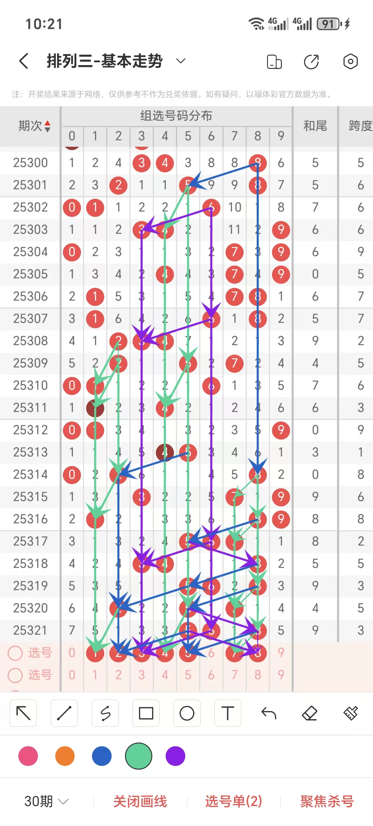 通常情况下在五期之内重复一个跨度的概率较高,近五期重复了3/5的跨度,近五期跨度为2/5/3/5/3,近期02路的跨度较热,本期要侧重3/4/6跨为主的号码组合。选择好跨度就可以从跨度方面选择相应的双胆码组合,双胆码的选取要根据近期和历史的走势进一步的分析选取。