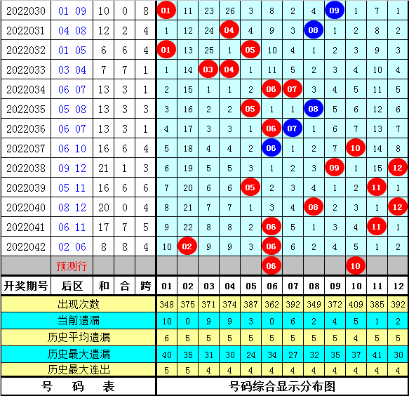 后区上期两码开出02和06,其号码遗漏值为22期+0期,本期后区注意热码和温码组合,参考四码01、05、06、10,两码看好06和10。