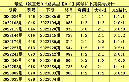 排列三上期开出奖号为:679,其直选012路类型为010,历史上直选010号码已开出了307次,最近11期分别开出奖号为:946、046、046、016、946、613、073、049、916、070、679。