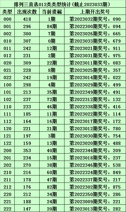 在以上统计中奖,直选010组合之后,下期奖号百位开出号码:023579,未开出号码1468,其中百位号码012路比为6:2:2,大小比为5:5,奇偶比为6:4,本期预计百位出现小号,精选一码3。