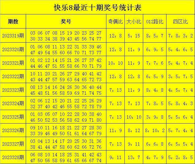 福彩快乐8第2023328期开奖回顾:06 08 10 14 18 25 31 41 42 43 47 50 56 58 59 61 65 66 67 74,其中奖号大小比为13:7,012路比为4:7:9,和值为841,跨度为68,奇偶比为9:11。