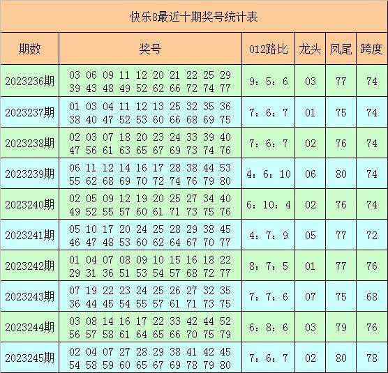 快乐8第2023245期奖号为:02 04 07 27 28 29 38 41 42 45 54 58 59 60 65 67 69 78 79 80,其中奖号012路比为7:6:7,跨度为78。