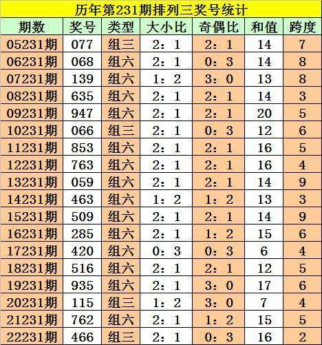 历年第231期排列三奖号:077 - 068 - 139 - 635 - 947 - 066 - 853 - 763 - 059 - 463 - 509 - 285 - 420 - 516 - 935 - 115 - 762 - 466。