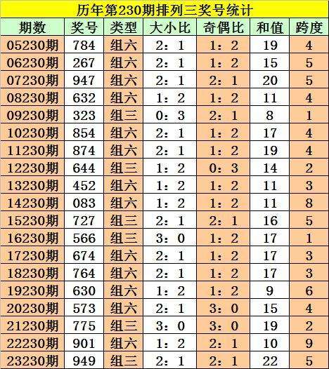 排列三第2023230期奖号:949,和值22,跨度5,大小比2:1,奇偶比2:1。