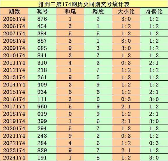从2004年至今排列三已开出6946期奖号了,本期为排列三2024年第175期开奖,历史同期已出现19次奖号: