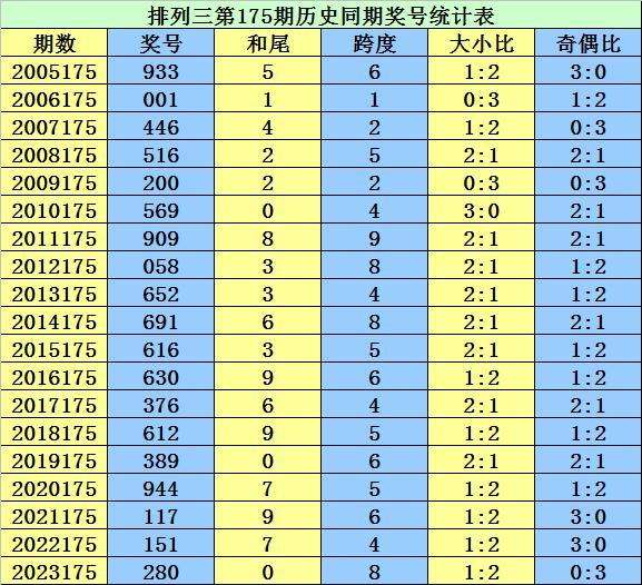 历年第175期排列三同期奖号开出:933、001、446、516、200、569、909、058、652、691、616、630、376、612、389、944、117、151、280。