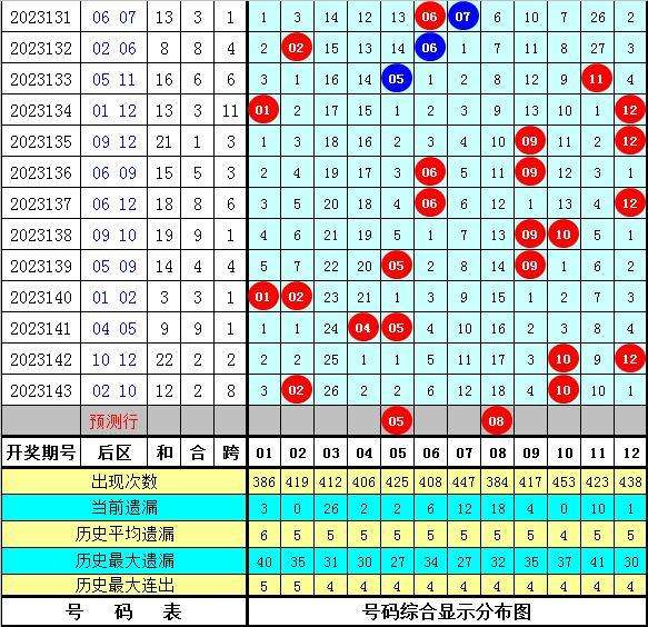 后区分析:后区上期开出号码02+10,和值为12,跨度为8。最近10区后一区(01-06)开出9个号码,断区3次,后二区(07-12)开出11个号码,断区2次,本期后一区注意号码:01、05;后二区注意号码:07、08、10、11。