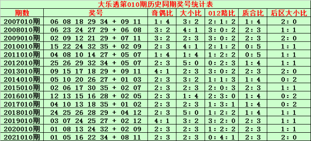 2、在历史同期第010期开奖中,前区号码奇偶总比例为34:41,偶数号码开出比例明显偏高,本期适当关注偶数号码转冷,注意奇偶比3:2;