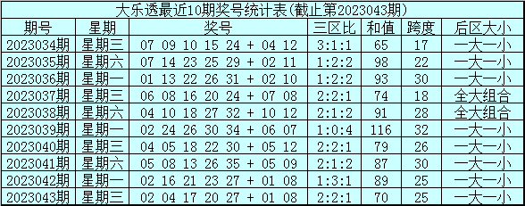 大乐透第2023043期奖号为,前区:02、04、17、20、27;后区:01、08。其中前区奖号三区比为2:2:1,和值为70,跨度为25,后区开出一大一小组合。