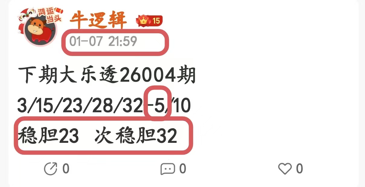 我是在26003期开完奖就定的金胆23.32,包括蓝球胆码5,这就中2+1了,但是在我印象中,一般提前出双色球的大乐透不再出,所以上期没有主看二路头尾,因为对不上,如果32不出,那么5也出不了,所以真是牵一发而动全身,让我想起了之前的2.4大乐透金胆,双色球全出,第二天用了一个,结果大乐透再次全出,转天双色球又出,你买的时候不出,不买就出了,所以得出结论,我看好的金胆,无论有没有被提前出,都要继续用。