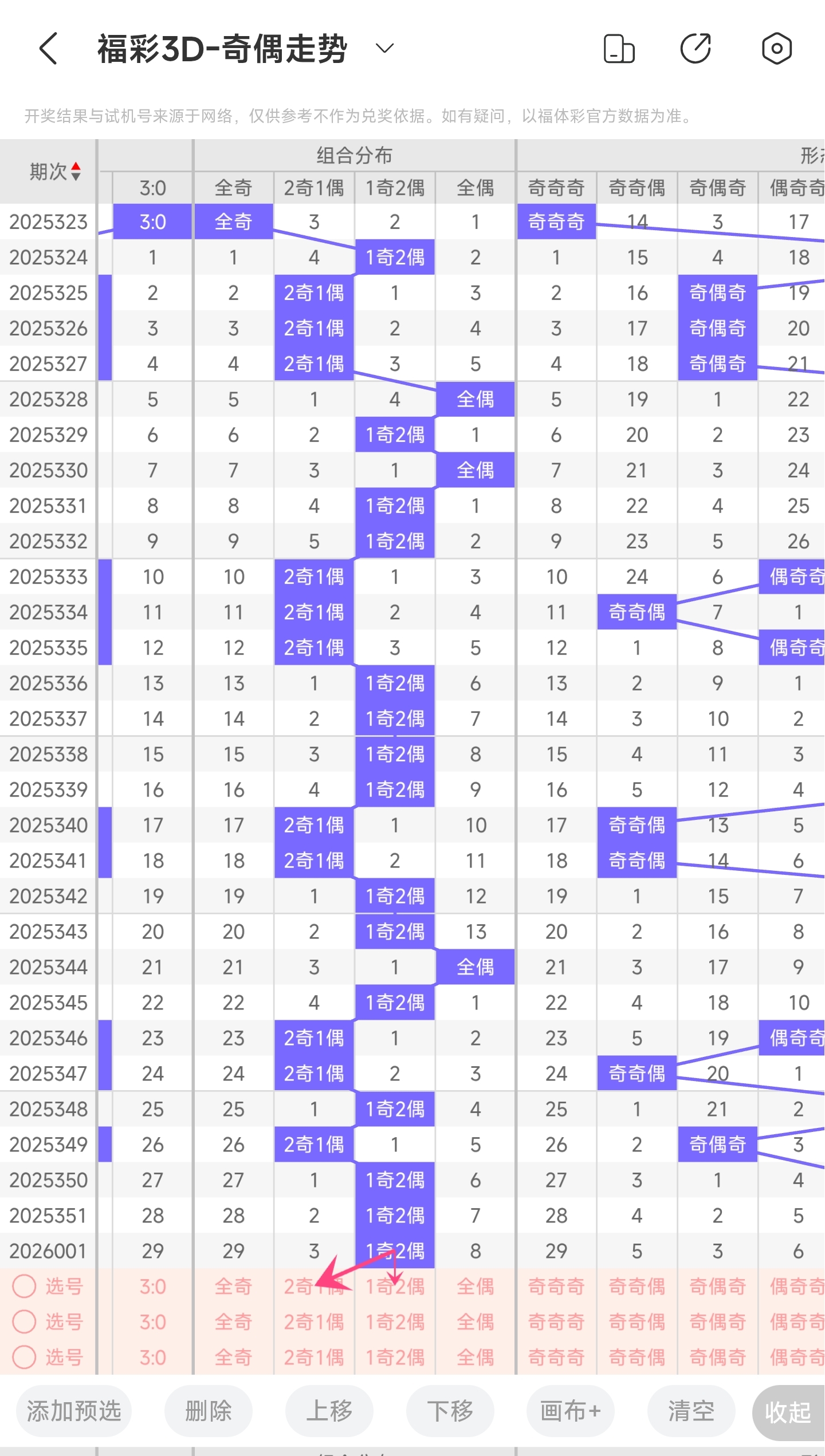 上期开了1奇2偶的情况,往前一期开出的是1奇2偶。从组合数学理论上来讲,开出2奇1偶和1奇2偶的概率都为37.5%,开出全偶和全奇的概率为12.5%。通过分析目前30期内的数据。本期的开出全偶的概率是10%,开出全奇的概率为3.33%,开出1奇2偶的概率为50%,开出2奇1偶的概率是36.66%。和前一期相比,1奇2偶概率变大,全偶概率变小。通过走势图可以看到,上期开1奇2偶,开了3期了,本期比较看好2奇1偶。所以本期推测可能开2奇1偶,其次是1奇2偶,然后是全奇或者全偶类型。