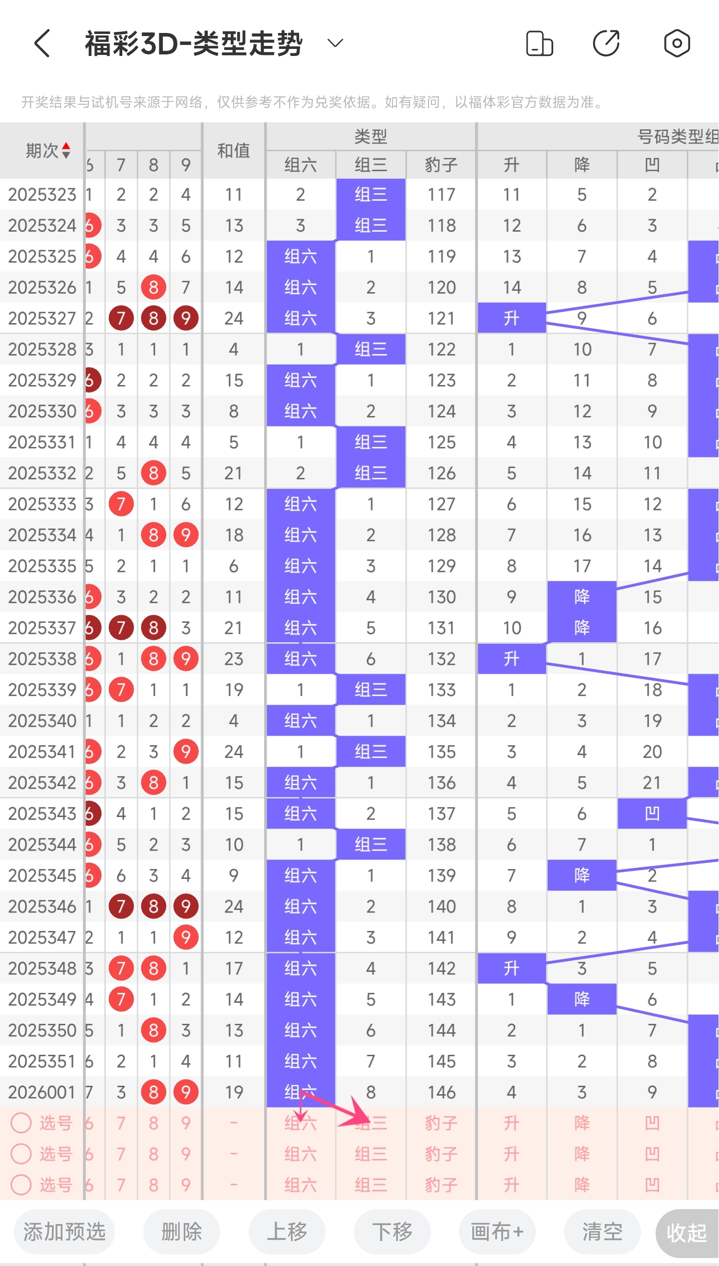 上期开出了组六类型,往前一期是组六类型。理论上开出组六的概率是72%,开出组三的概率是27%,开出豹子的概率是1%。通过分析目前30期内已经开出的概率,组六概率为73.33%,开出组三概率是26.66%。开出豹子的概率为0%。与前一期相比,组六概率变大,组三概率变小。通过走势图可以看到上期开了组六,组六开了8期,本期要严防组三了。所以本期组六和组三都关注一下。
