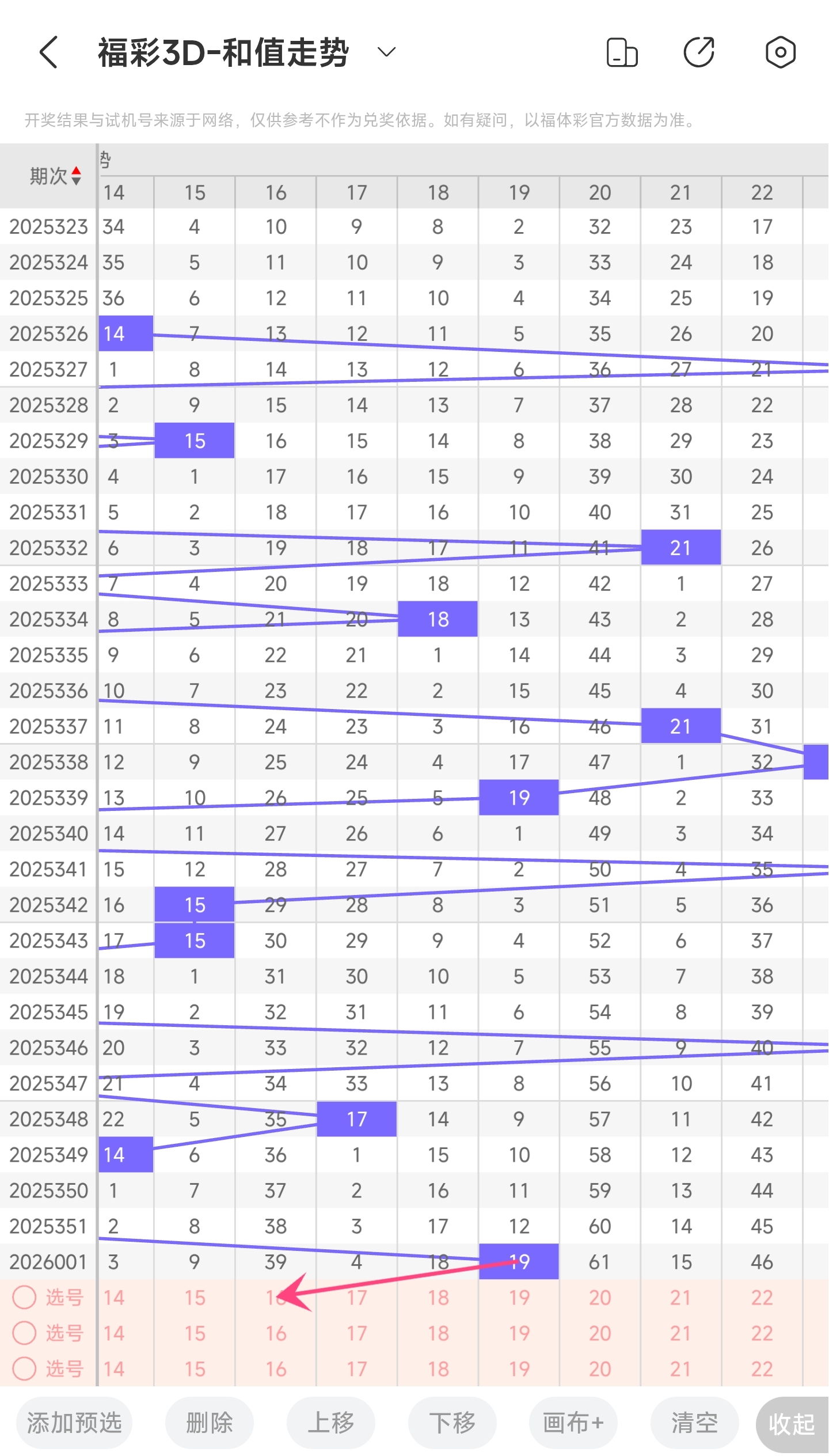 上期和值是19,往前一期和值是11。和值往右移动,偏移振幅为8。19和值也是处于近30期内开出的比较大的和值。上升的空间比较小,下降的空间比较大,本期看好和值变小,所以本期趋势是大概率往左的。因此推测本期和值趋势是大概率往左的,和值变小,小概率往右,和值变大。