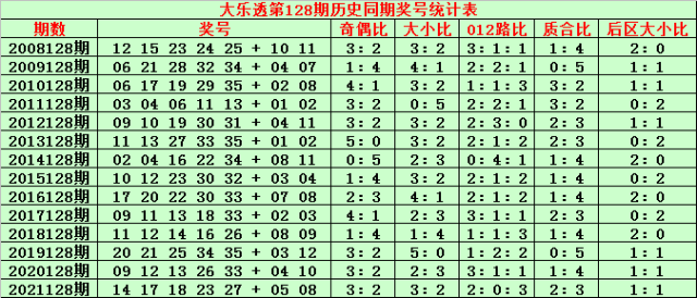 3、在历史同期第128期开奖中,前区号码大小总比例为38:32,大号表现相对较热,本期看好大号继续热出,关注大小比3:2出现;