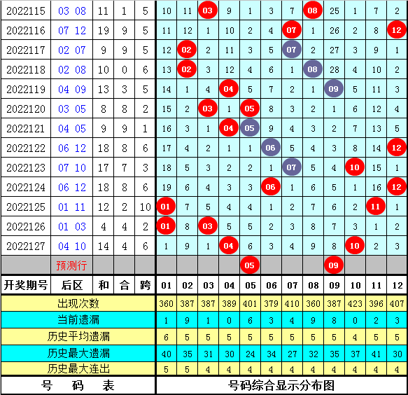 6、在历史同期第128期开奖中,后区全大组合出现4次,全小组合出现4次,一大一小组合出现6次,本期后区注意一大一小组合出现,关注号码05、07、09、12。