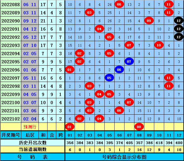 后区分析:上期后区奖号为02+04,遗漏期数为6期+2期。,目前后区热码有6个:02、03、04、05、06、07,后区温码有3个:01、10、11,后区冷码有3个:08、09、12,本期后区看好号码01、02、03、07、08,单挑一注01+08。