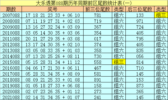 在大乐透第088期历年同期奖号中,前区前三位尾数出号频次分别为:尾数7出现8个,尾数1出现7个,尾数3、5、8出现6个,尾数4出现4个,尾数0、2、6、9出现2个。其中尾数数字三类型豹子、组三、组六次数比为0:1:14,今年同期前三位尾数类型参考组六;