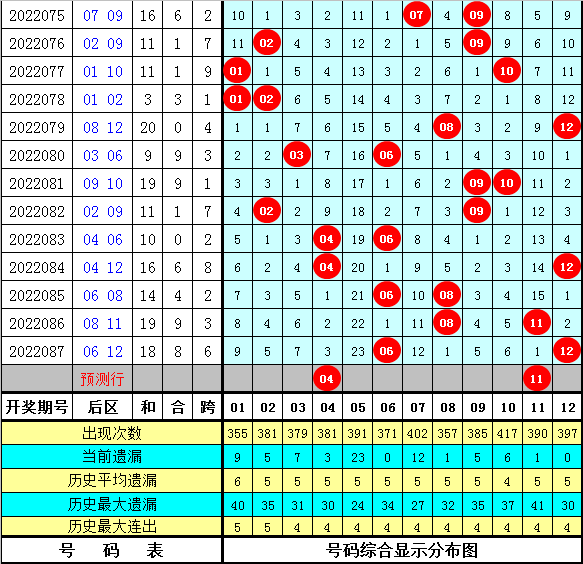 上期回顾:大乐透第2022087期开出奖号:04 06 10 24 28 + 06 12,前区包含4个尾数:0、4、6、8,后区开出全偶、一大一小组合。